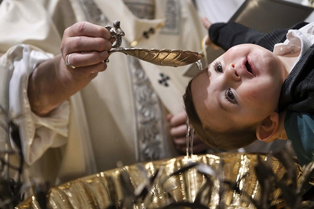 프란치스코 교황이 주님 세례 축일을 맞아 교황청 직원의 한 아이에게 세례를 주고 있다. 교황청 신앙교리성은 8월 6일 수정된 양식을 사용한 세례성사는 성사 자체가 유효하지 않다는 판결문을 발표했다.