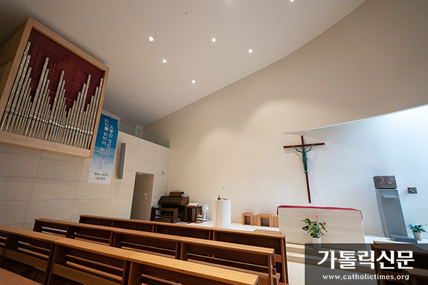 1층에 마련된 성가정 대성당. 200여 명을 수용할 수 있는 성당은 하느님을 편하게 만날 수 있도록 아늑하고 따뜻한 분위기로 꾸며졌다.
